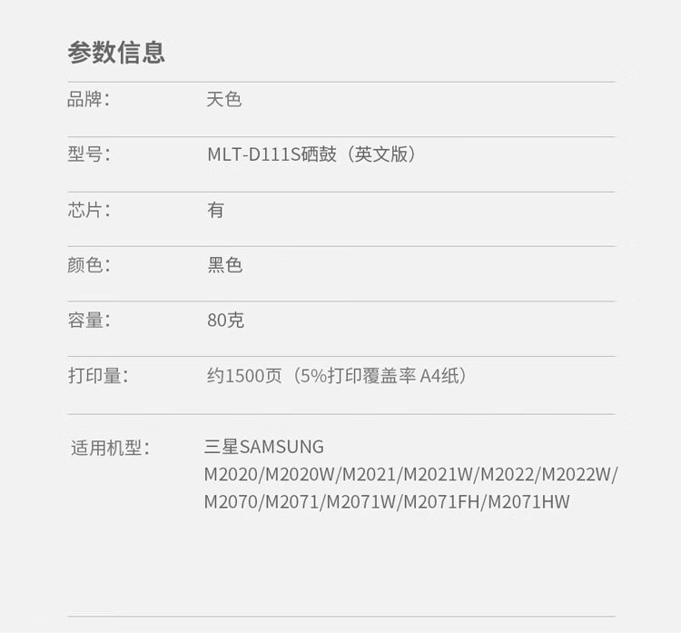 > 办公耗材 复印纸 硒鼓 > 打印耗材 > 硒鼓 > 天色 硒鼓 D111S 英文易加版(适用于 SamsungM2020/M2020W/M2021/M2021W/M2022/M2023W)阳光旗舰版| 产品名称 : | 天色 硒鼓 D111S 英文易加版(适用于 SamsungM2020/M2020W/M2021/M2021W/M2022/M2023W)阳光旗舰版 |