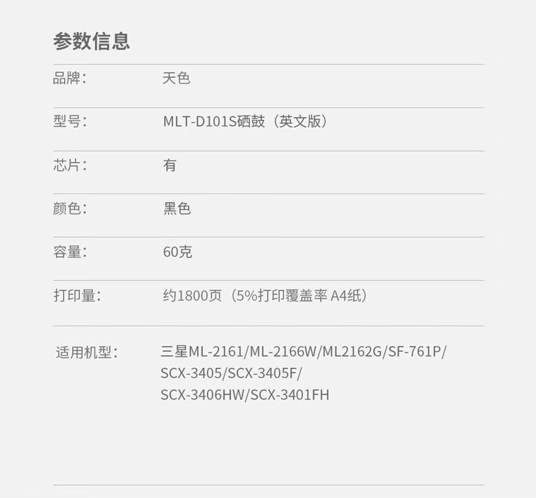 > 办公耗材 复印纸 硒鼓 > 打印耗材 > 硒鼓 > 天色 硒鼓 D101S 英文易加版(适用于 SamsungXpressML-2161/ML-2166W/2162G/SF-761PSCX-3405)阳光旗舰版| 产品名称 : | 天色 硒鼓 D101S 英文易加版(适用于 SamsungXpressML-2161/ML-2166W/2162G/SF-761PSCX-3405)阳光旗舰版 |