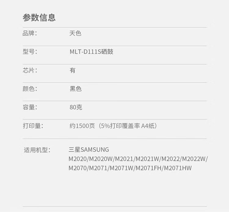 > 办公耗材 复印纸 硒鼓 > 打印耗材 > 硒鼓 > 天色 硒鼓 D111S 易加版(适用于 SamsungM2020/M2020W/M2021/M2021W/M2022/M2022W)阳光旗舰版| 产品名称 : | 天色 硒鼓 D111S 易加版(适用于 SamsungM2020/M2020W/M2021/M2021W/M2022/M2022W)阳光旗舰版 |