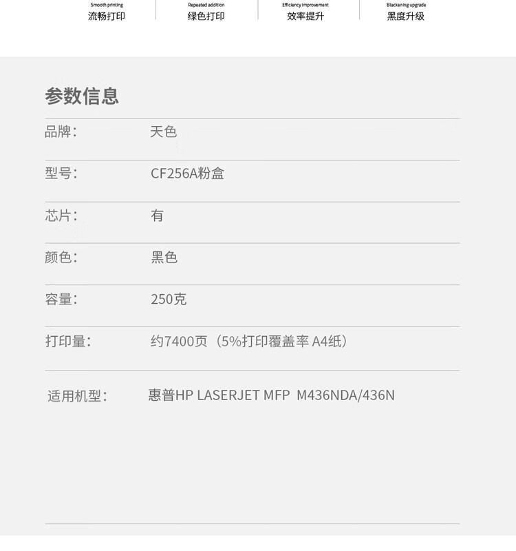 | 产品名称 : | 天色 粉盒 CF256A (适用于 HP LaserJetPro MFP M436nda/436n)阳光旗舰版 |