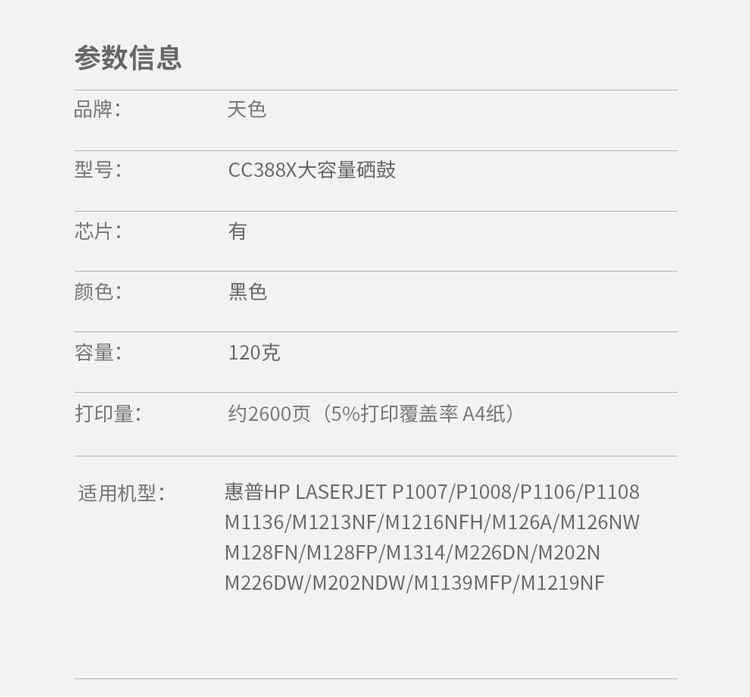 > 办公耗材 复印纸 硒鼓 > 打印耗材 > 硒鼓 > 天色 硒鼓 兼容惠普 CC388X 大容量(适用于 HPLaserjetP1007/P1008/M1136/M1212nf/M1213nf/)阳光旗舰版| 产品名称 : | 天色 硒鼓 兼容惠普 CC388X 大容量(适用于 HPLaserjetP1007/P1008/M1136/M1212nf/M1213nf/)阳光旗舰版 |