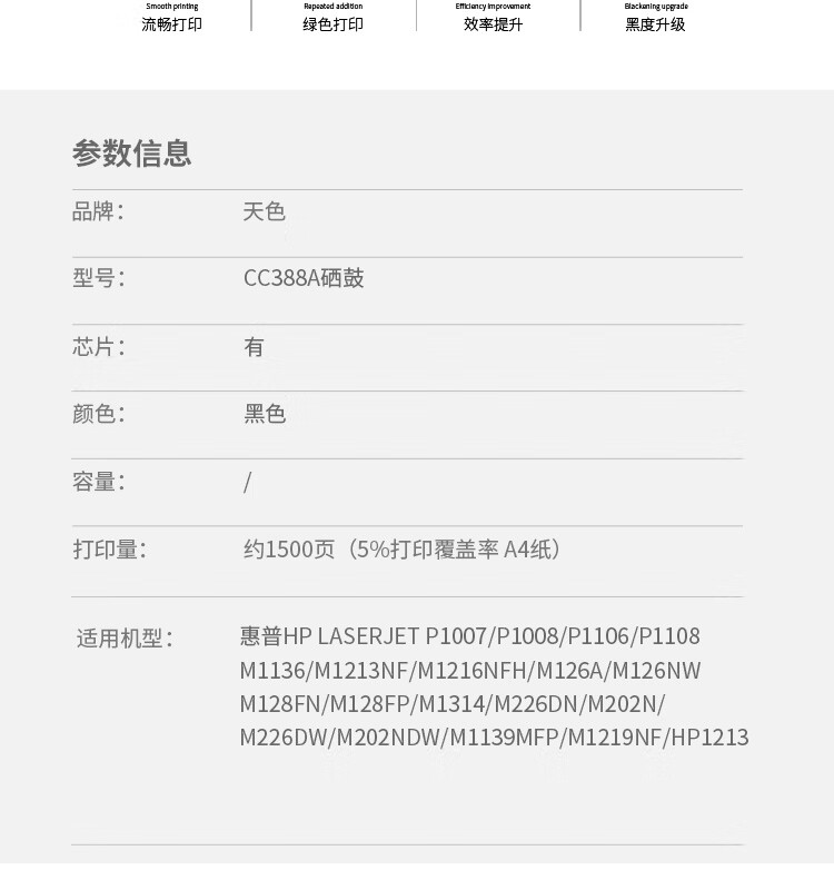 > 办公耗材 复印纸 硒鼓 > 打印耗材 > 硒鼓 > 天色 硒鼓 CC388A (适用于 HPLaserjetP1007/P1008/M1136/M1212nf/M1213nf/M1216nfh/)(阳光旗舰版)| 产品名称 : | 天色 硒鼓 CC388A (适用于 HPLaserjetP1007/P1008/M1136/M1212nf/M1213nf/M1216nfh/)(阳光旗舰版) |