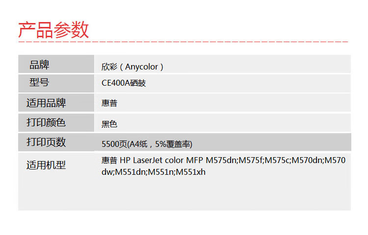 > 办公耗材 复印纸 硒鼓 > 打印耗材 > 硒鼓 > 欣彩(Anycolor)CE400A硒鼓(专业版)507A黑色AR-M551K适用惠普HPM551n M575dn M575fw M551n M551dn| 产品名称 : | 欣彩(Anycolor)CE400A硒鼓(专业版)507A黑色AR-M551K适用惠普HPM551n M575dn M575fw M551n M551dn |