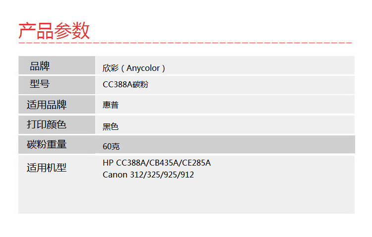 > 办公耗材 复印纸 硒鼓 > 打印耗材 > 硒鼓 > 欣彩(Anycolor)CC388A碳粉 AT-388A 60g墨粉 适用惠普HP CC388A CB435A CE285A 佳能312 325 925 912硒鼓| 产品名称 : | 欣彩(Anycolor)CC388A碳粉 AT-388A 60g墨粉 适用惠普HP CC388A CB435A CE285A 佳能312 325 925 912硒鼓 |