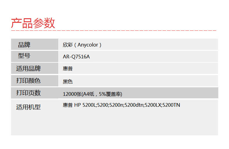 > 办公耗材 复印纸 硒鼓 > 打印耗材 > 硒鼓 > 欣彩(Anycolor) AR-Q7516A(专业版)Q7516A 硒鼓 16A 适用惠普HP 5200 5200n 5200LX 打印机耗材| 产品名称 : | 欣彩(Anycolor) AR-Q7516A(专业版)Q7516A 硒鼓 16A 适用惠普HP 5200 5200n 5200LX 打印机耗材 |