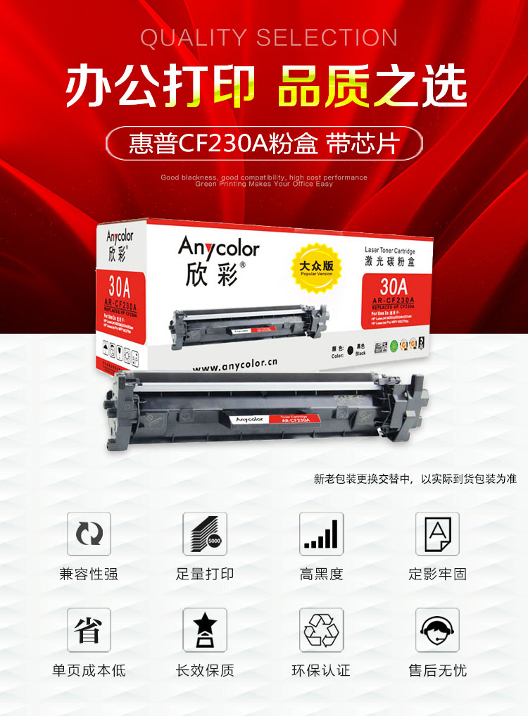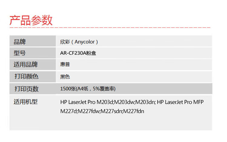 > 办公耗材 复印纸 硒鼓 > 打印耗材 > 硒鼓 > 欣彩 CF230A带芯片 大众版 AR-CF230A粉盒 hp30A 适用惠普HP M203dw M203d dn dw M227d M227fdw sdn fdn| 产品名称 : | 欣彩 CF230A带芯片 大众版 AR-CF230A粉盒 hp30A 适用惠普HP M203dw M203d dn dw M227d M227fdw sdn fdn |