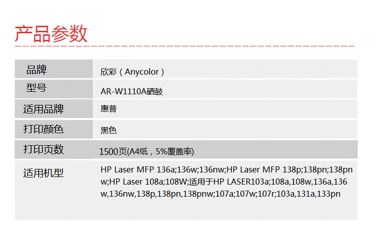 > 办公耗材 复印纸 硒鼓 > 打印耗材 > 硒鼓 > 欣彩 W1110A硒鼓 AR-W1110A带芯片 1.5K 110A 适用惠普108w 108a 136w 136a MFP 136nw 138pnw 138pn| 产品名称 : | 欣彩 W1110A硒鼓 AR-W1110A带芯片 1.5K 110A 适用惠普108w 108a 136w 136a MFP 136nw 138pnw 138pn |