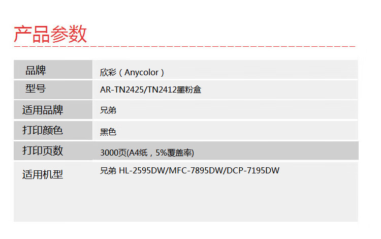 > 办公耗材 复印纸 硒鼓 > 打印耗材 > 硒鼓 > 欣彩(Anycolor)TN-2425墨粉盒 专业版 AR-TN2425/TN2412 适用兄弟MFC7895DW DCP7195DW HL2595DW| 产品名称 : | 欣彩(Anycolor)TN-2425墨粉盒 专业版 AR-TN2425/TN2412 适用兄弟MFC7895DW DCP7195DW HL2595DW |