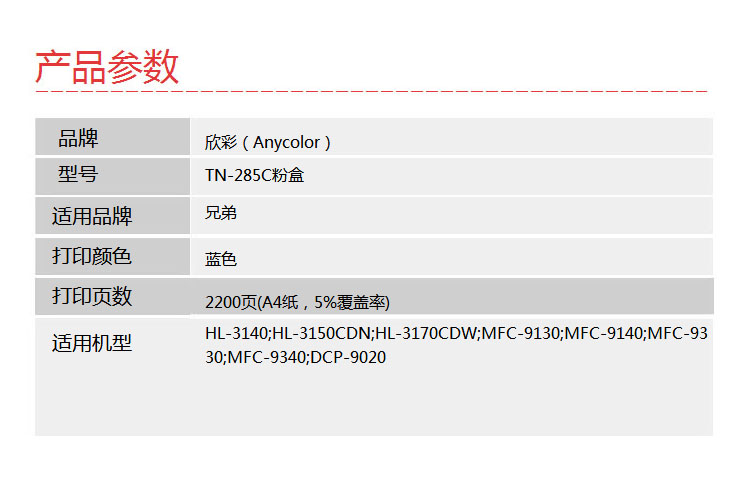 > 办公耗材 复印纸 硒鼓 > 打印耗材 > 硒鼓 > 欣彩(Anycolor)TN-285C粉盒(专业版)AR-TN285C蓝色 墨粉盒 适用适用兄弟3170CDW 3150CDN 9020CDN| 产品名称 : | 欣彩(Anycolor)TN-285C粉盒(专业版)AR-TN285C蓝色 墨粉盒 适用适用兄弟3170CDW 3150CDN 9020CDN |