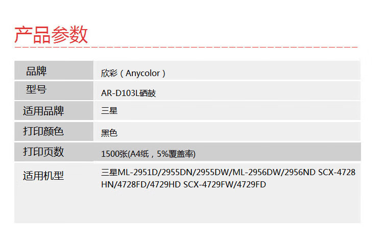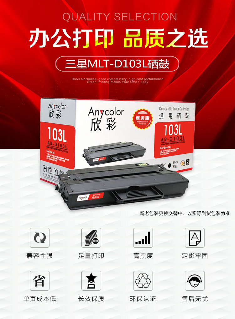 > 办公耗材 复印纸 硒鼓 > 打印耗材 > 硒鼓 > 欣彩 MLT-D103L硒鼓 商务版 AR-D103L 适用三星 ML-2951D 2955DN 2955DW ML-2956DW 打印机| 产品名称 : | 欣彩 MLT-D103L硒鼓 商务版 AR-D103L 适用三星 ML-2951D 2955DN 2955DW ML-2956DW 打印机 |