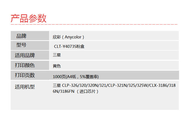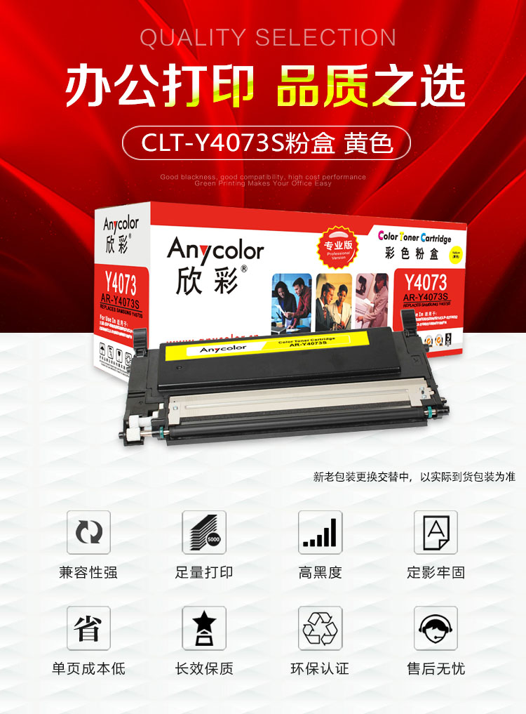 > 办公耗材 复印纸 硒鼓 > 打印耗材 > 硒鼓 > 欣彩(Anycolor)CLT-Y4073S粉盒(专业版)AR-Y4073S黄色 适用三星 CLP-326 320 320N 321 CLP-321N 325| 产品名称 : | 欣彩(Anycolor)CLT-Y4073S粉盒(专业版)AR-Y4073S黄色 适用三星 CLP-326 320 320N 321 CLP-321N 325 |