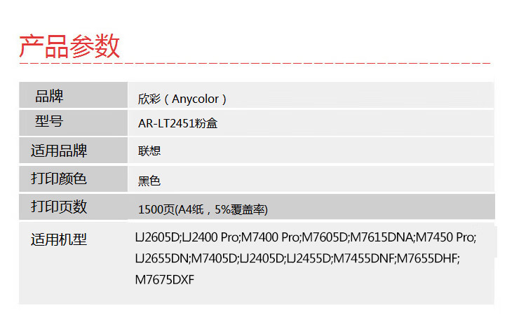 > 办公耗材 复印纸 硒鼓 > 打印耗材 > 硒鼓 > 欣彩 LT2451粉盒 专业版 AR-LT2451碳粉盒 适用联想LJ2605D LJ2655DN M7605D M7615DNA M7455DNF 7655DHF| 产品名称 : | 欣彩 LT2451粉盒 专业版 AR-LT2451碳粉盒 适用联想LJ2605D LJ2655DN M7605D M7615DNA M7455DNF 7655DHF |