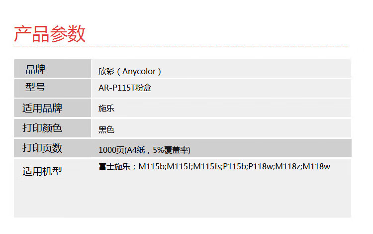 > 办公耗材 复印纸 硒鼓 > 打印耗材 > 硒鼓 > 欣彩(Anycolor)P115b墨粉盒(专业版)CT202138 AR-P115T适用富士施乐P115b M115b M115f M115fs P118w| 产品名称 : | 欣彩(Anycolor)P115b墨粉盒(专业版)CT202138 AR-P115T适用富士施乐P115b M115b M115f M115fs P118w |