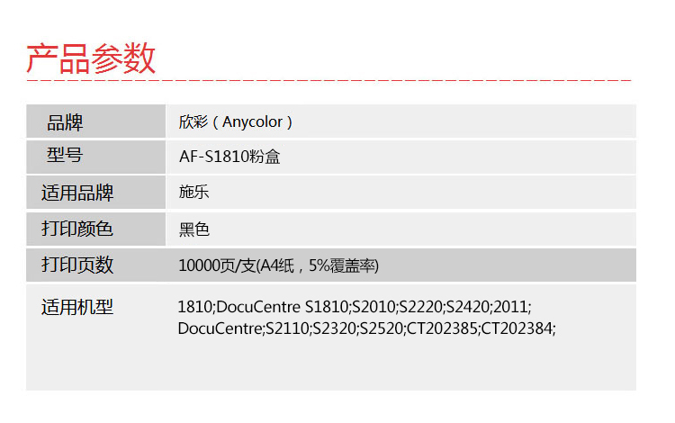 > 办公耗材 复印纸 硒鼓 > 打印耗材 > 硒鼓 > 欣彩 S1810/2011/2110粉盒 高容2支装 AF-S1810 适用施乐 S2320 2520 S1810 S2011 S2110N S2110NDA CT202385| 产品名称 : | 欣彩 S1810/2011/2110粉盒 高容2支装 AF-S1810 适用施乐 S2320 2520 S1810 S2011 S2110N S2110NDA CT202385 |