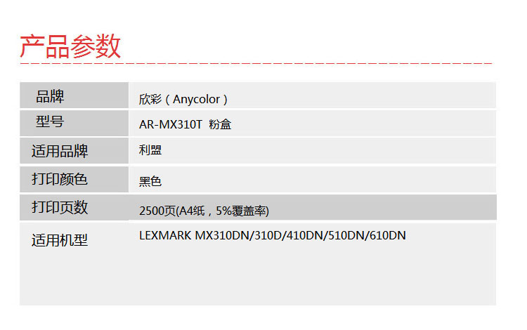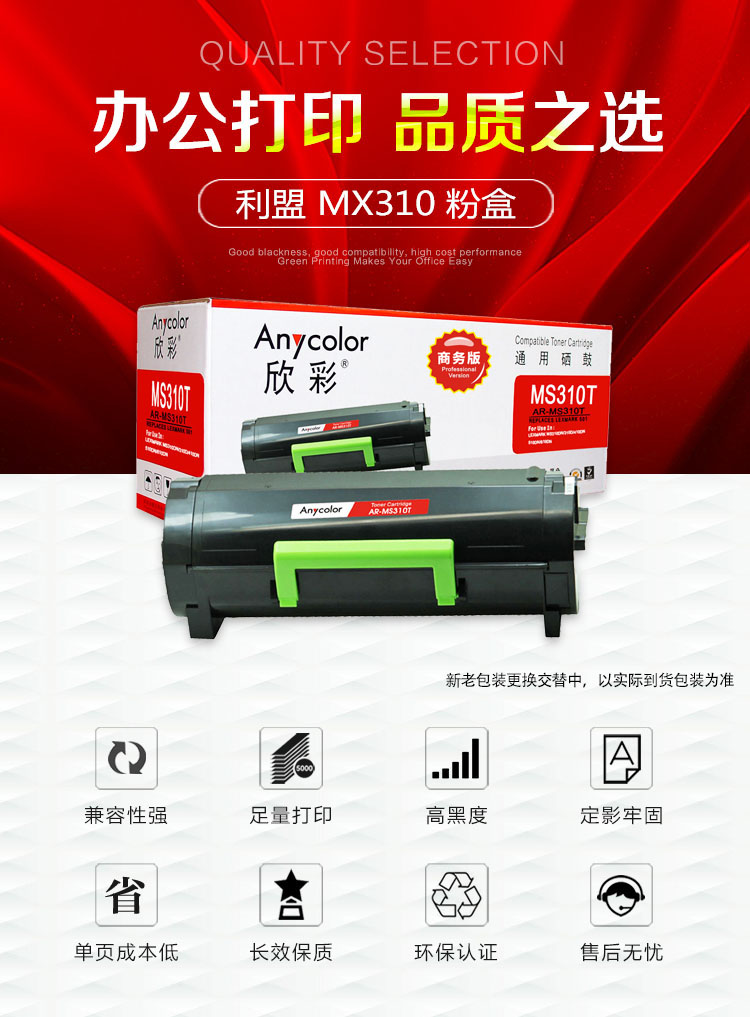 > 办公耗材 复印纸 硒鼓 > 打印耗材 > 硒鼓 > 欣彩 MX310 粉盒 商务版 AR-MX310T 2.5K 适用利盟LEXMARK MX310DN 310D 410DN 510DN 610DN| 产品名称 : | 欣彩 MX310 粉盒 商务版 AR-MX310T 2.5K 适用利盟LEXMARK MX310DN 310D 410DN 510DN 610DN |