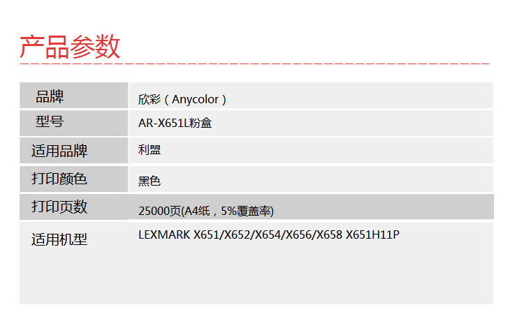 > 办公耗材 复印纸 硒鼓 > 打印耗材 > 硒鼓 > 欣彩(Anycolor)X651 粉盒(专业版) AR-X651L 大容量25K 适用利盟LEXMARK X651 X652 X654 X656 X651H11P| 产品名称 : | 欣彩(Anycolor)X651 粉盒(专业版) AR-X651L 大容量25K 适用利盟LEXMARK X651 X652 X654 X656 X651H11P |