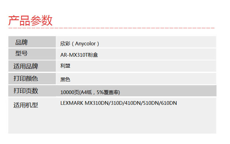> 办公耗材 复印纸 硒鼓 > 打印耗材 > 硒鼓 > 欣彩(Anycolor)MX310 粉盒(专业版)AR-MX310TS 10K大容量 适用利盟LEXMARK MX310DN 310D 410DN 510DN| 产品名称 : | 欣彩(Anycolor)MX310 粉盒(专业版)AR-MX310TS 10K大容量 适用利盟LEXMARK MX310DN 310D 410DN 510DN |