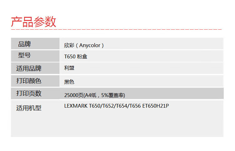 > 办公耗材 复印纸 硒鼓 > 打印耗材 > 硒鼓 > 欣彩(Anycolor)T650 粉盒(专业版)AR-T650L 大容量25K 适用利盟LEXMARK T650 T652 T654 T656 打印机| 产品名称 : | 欣彩(Anycolor)T650 粉盒(专业版)AR-T650L 大容量25K 适用利盟LEXMARK T650 T652 T654 T656 打印机 |