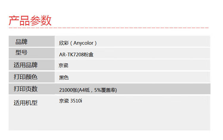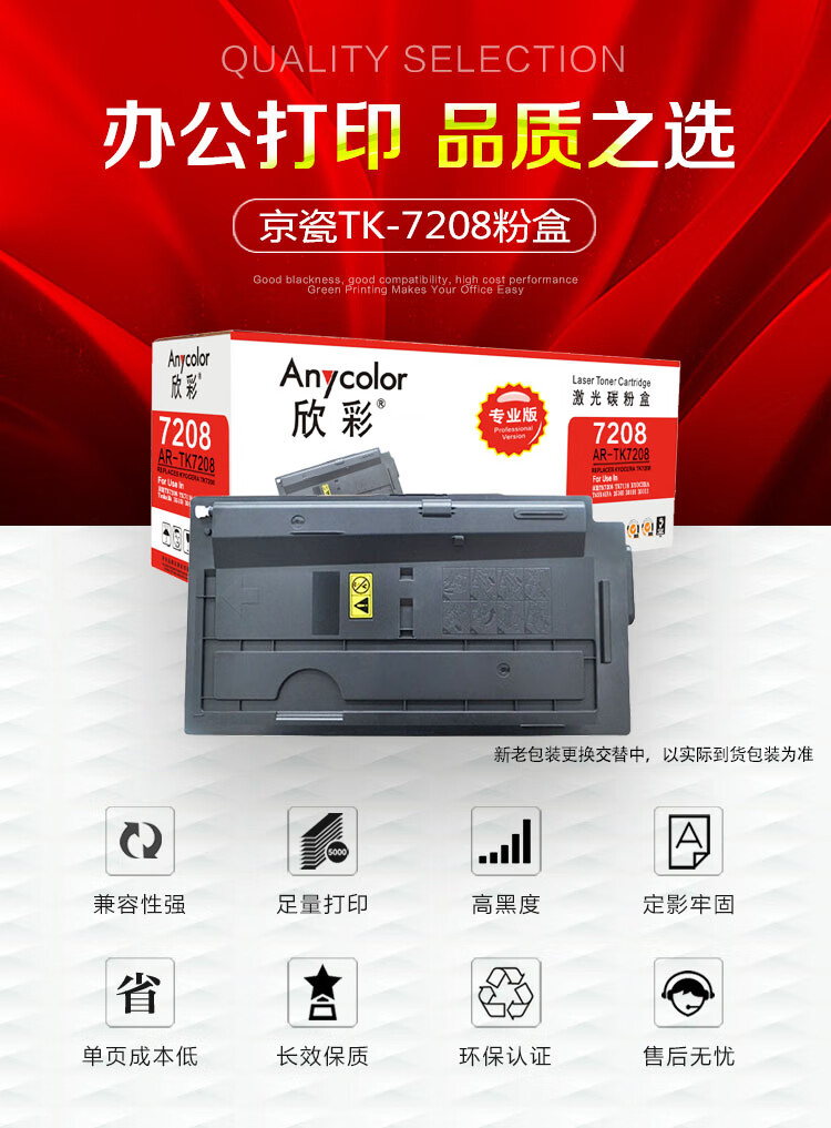 | 产品名称 : | 欣彩(Anycolor)TK-7208墨粉盒 专业版 AR-TK7208 适用京瓷 TASKalfa 3510i 打印机 |