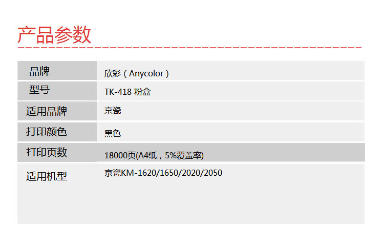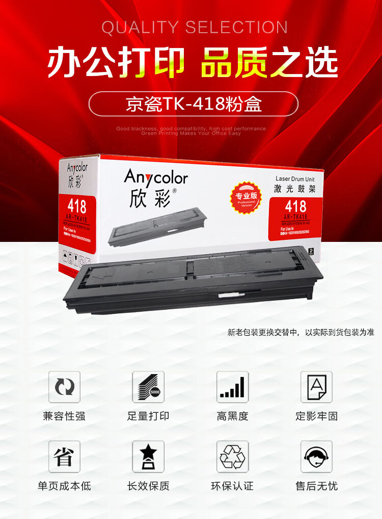 | 产品名称 : | 欣彩(Anycolor)TK-418粉盒(专业版)AR-TK418 适用京瓷 KM-1620 1650 2020 2050 |