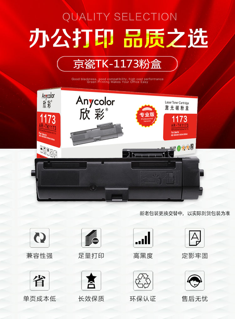 | 产品名称 : | 欣彩(Anycolor)TK-1173粉盒 专业版 AR-TK1173墨粉组件 适用京瓷KYOCERA M2540dn |