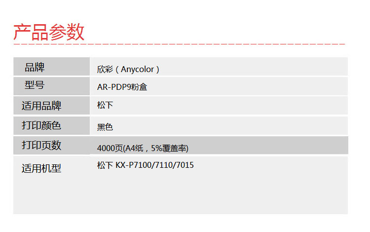 | 产品名称 : | 欣彩(Anycolor)KX-PDP9粉盒(专业版)AR-PDP9墨粉筒 适用松下 KX-P7100 7110 7015 |