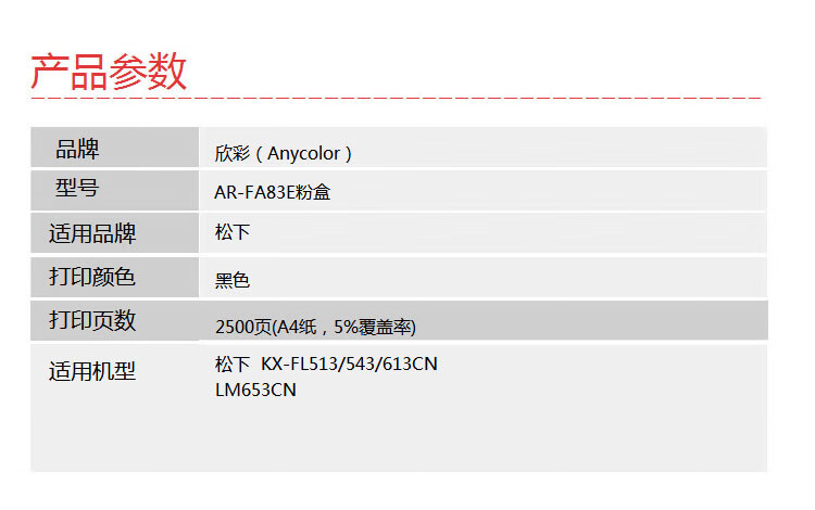 > 办公耗材 复印纸 硒鼓 > 打印耗材 > 硒鼓 > 欣彩(Anycolor)KX-FA83E粉盒(专业版)AR-83E墨粉筒 适用松下 KX-FL513 543 613CN LM653CN| 产品名称 : | 欣彩(Anycolor)KX-FA83E粉盒(专业版)AR-83E墨粉筒 适用松下 KX-FL513 543 613CN LM653CN |