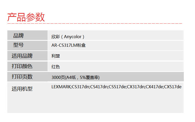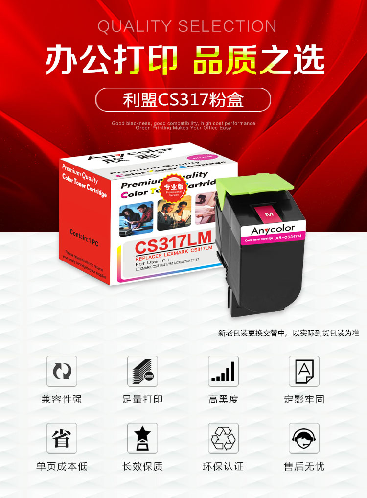> 办公耗材 复印纸 硒鼓 > 打印耗材 > 硒鼓 > 欣彩(Anycolor)71B10M0碳粉盒 专业版 AR-CS317LM红色3K 适用利盟LEXMARK CS317dn 417dn 517de CX317硒鼓| 产品名称 : | 欣彩(Anycolor)71B10M0碳粉盒 专业版 AR-CS317LM红色3K 适用利盟LEXMARK CS317dn 417dn 517de CX317硒鼓 |