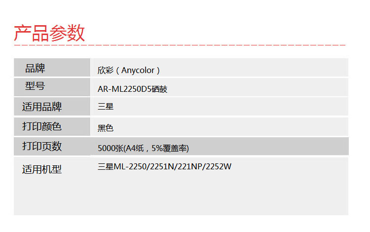 > 办公耗材 复印纸 硒鼓 > 打印耗材 > 硒鼓 > 欣彩(Anycolor)ML-2250D5硒鼓(专业版)AR-ML2250D5 适用三星 ML-2250 2251N 221NP 2252W 打印机| 产品名称 : | 欣彩(Anycolor)ML-2250D5硒鼓(专业版)AR-ML2250D5 适用三星 ML-2250 2251N 221NP 2252W 打印机 |