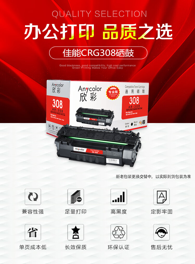 | 产品名称 : | 欣彩(Anycolor)CRG308硒鼓(专业版)AR-308黑色 适用佳能LBP3300 3360 |