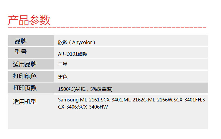 产品名称 : 欣彩 MLT-D101S硒鼓 大众版 AR-D101S 适用三星ML-2161 SCX-3401 打印机