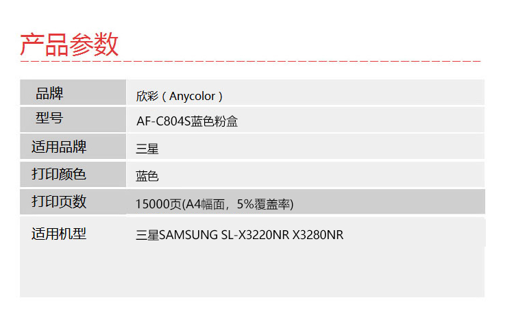 > 办公耗材 复印纸 硒鼓 > 打印耗材 > 硒鼓 > 欣彩(Anycolor)CLT-C804S墨粉盒 AF-C804S蓝色 适用SAMSUNG SL-X3220NR X3280NR| 产品名称 : | 欣彩(Anycolor)CLT-C804S墨粉盒 AF-C804S蓝色 适用SAMSUNG SL-X3220NR X3280NR |