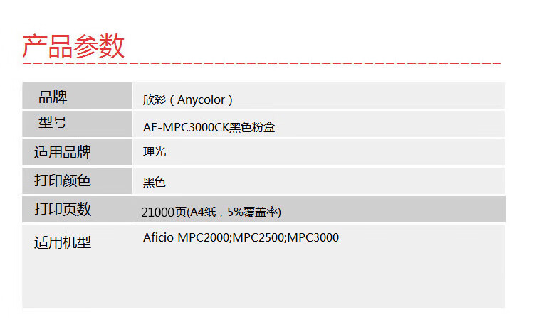 > 办公耗材 复印纸 硒鼓 > 打印耗材 > 硒鼓 > 欣彩(Anycolor) MP C3000C粉盒 AF-MPC3000CK黑色 适用理光Aficio MPC2000 MPC2500 MPC3000复印机粉筒| 产品名称 : | 欣彩(Anycolor) MP C3000C粉盒 AF-MPC3000CK黑色 适用理光Aficio MPC2000 MPC2500 MPC3000复印机粉筒 |