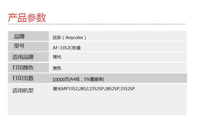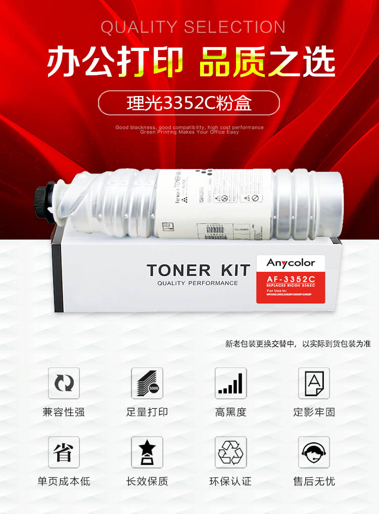 > 办公耗材 复印纸 硒鼓 > 打印耗材 > 硒鼓 > 欣彩(Anycolor) 3352C粉盒 AF-3352C墨粉盒 适用理光 MP3352 2852 2352SP 2852SP 3352SP 复印机| 产品名称 : | 欣彩(Anycolor) 3352C粉盒 AF-3352C墨粉盒 适用理光 MP3352 2852 2352SP 2852SP 3352SP 复印机 |