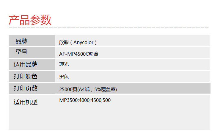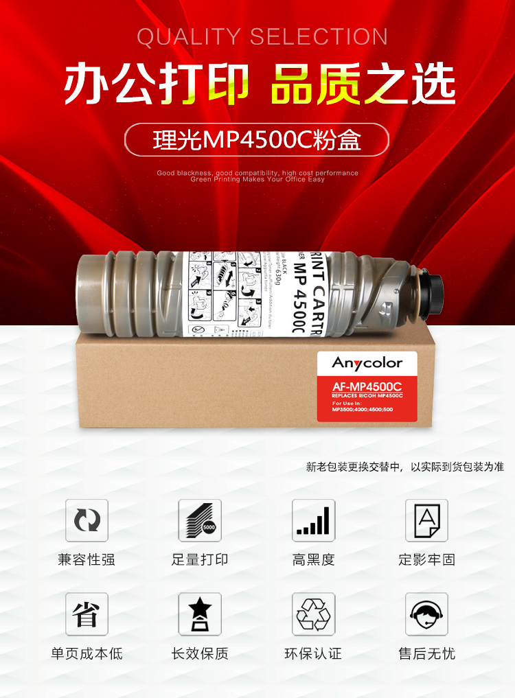 > 办公耗材 复印纸 硒鼓 > 打印耗材 > 硒鼓 > 欣彩(Anycolor)MP4500C粉盒 AF-MP4500C 适用理光 MP3500 4000 4500 500 复印机墨粉筒| 产品名称 : | 欣彩(Anycolor)MP4500C粉盒 AF-MP4500C 适用理光 MP3500 4000 4500 500 复印机墨粉筒 |