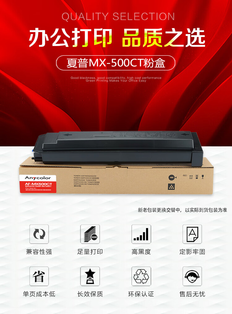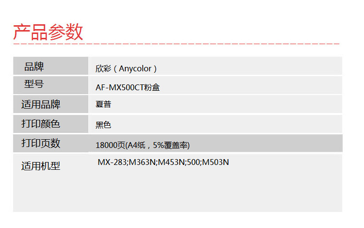 > 办公耗材 复印纸 硒鼓 > 打印耗材 > 硒鼓 > 欣彩(Anycolor)MX-500CT粉盒 AF-MX500CT 适用夏普Sharp MX-283 M363N M453N 500 M503N 复印机| 产品名称 : | 欣彩(Anycolor)MX-500CT粉盒 AF-MX500CT 适用夏普Sharp MX-283 M363N M453N 500 M503N 复印机 |
