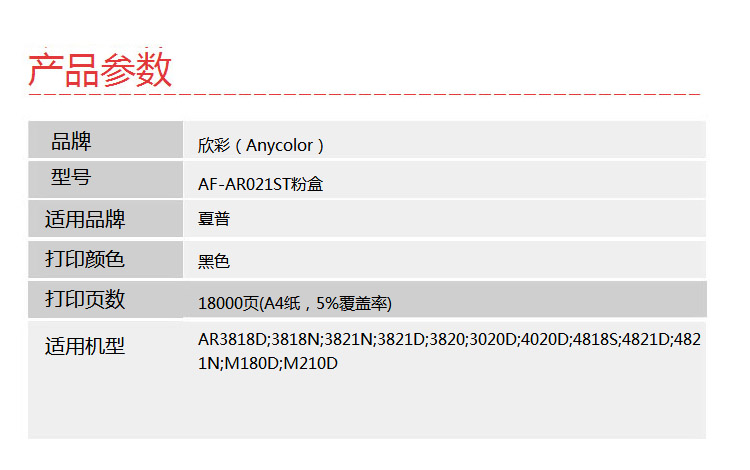 > 办公耗材 复印纸 硒鼓 > 打印耗材 > 硒鼓 > 欣彩 AR-021ST墨粉盒 商务版 AF-AR021ST 适用夏普AR3818D 3818N 3821N 3821D 3820 3020D 4020D 4818S| 产品名称 : | 欣彩 AR-021ST墨粉盒 商务版 AF-AR021ST 适用夏普AR3818D 3818N 3821N 3821D 3820 3020D 4020D 4818S |