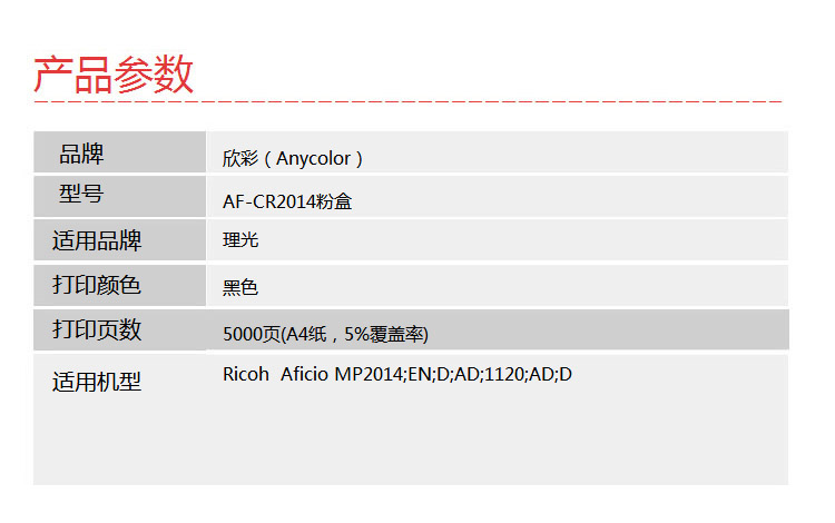 > 办公耗材 复印纸 硒鼓 > 打印耗材 > 硒鼓 > 欣彩(Anycolor)MP2014C墨粉盒 AF-CR2014 适用理光Ricoh Aficio MP2014 EN D AD 1120 AD D 复印机| 产品名称 : | 欣彩(Anycolor)MP2014C墨粉盒 AF-CR2014 适用理光Ricoh Aficio MP2014 EN D AD 1120 AD D 复印机 |