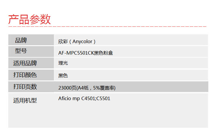 > 办公耗材 复印纸 硒鼓 > 打印耗材 > 硒鼓 > 欣彩(Anycolor)MP C5501C粉盒 AF-MPC5501CK黑色 适用理光Aficio mp C4501 C5501 复印机墨粉筒| 产品名称 : | 欣彩(Anycolor)MP C5501C粉盒 AF-MPC5501CK黑色 适用理光Aficio mp C4501 C5501 复印机墨粉筒 |