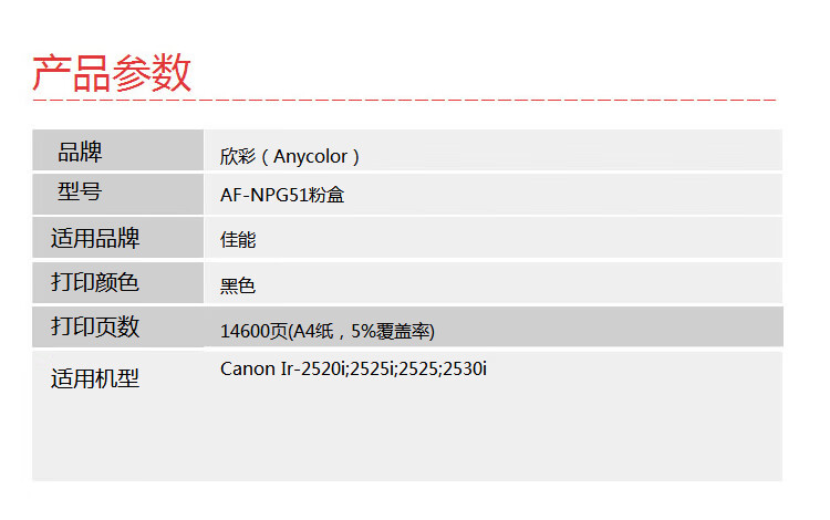 > 办公耗材 复印纸 硒鼓 > 打印耗材 > 硒鼓 > 欣彩(Anycolor) NPG-51粉盒 专业版 AF-NPG51墨粉筒 适用佳能 Canon Ir-2520i 2525i 2525 2530i 复印机| 产品名称 : | 欣彩(Anycolor) NPG-51粉盒 专业版 AF-NPG51墨粉筒 适用佳能 Canon Ir-2520i 2525i 2525 2530i 复印机 |