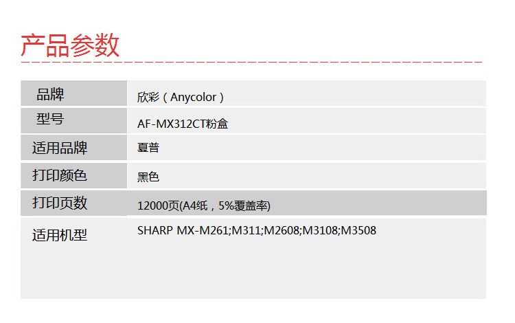> 办公耗材 复印纸 硒鼓 > 打印耗材 > 硒鼓 > 欣彩(Anycolor)MX-312CT墨粉盒 AF-MX312CT 适用夏普SHARP MX-M261 M311 M2608 M3108 M3508复印机| 产品名称 : | 欣彩(Anycolor)MX-312CT墨粉盒 AF-MX312CT 适用夏普SHARP MX-M261 M311 M2608 M3108 M3508复印机 |