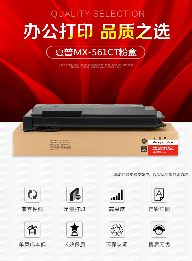 > 办公耗材 复印纸 硒鼓 > 打印耗材 > 硒鼓 > 欣彩(Anycolor)MX-561CT粉盒 AF-MX561CT 适用夏普SHARP MXB4621R 4608 4658 复印机| 产品名称 : | 欣彩(Anycolor)MX-561CT粉盒 AF-MX561CT 适用夏普SHARP MXB4621R 4608 4658 复印机 |
