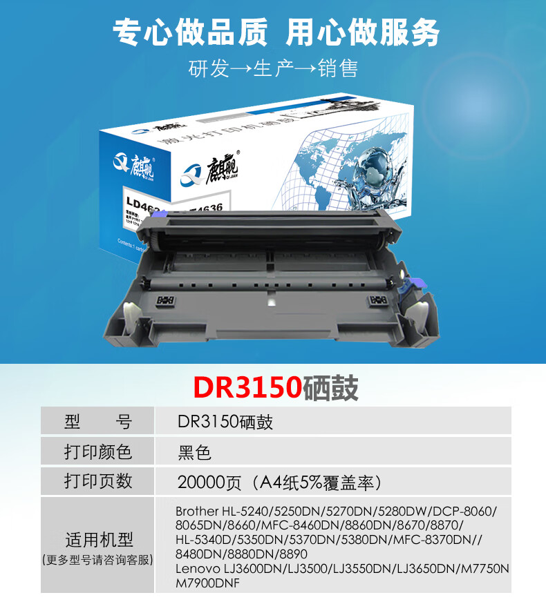 | 产品名称 : | 麒舰 DR3150硒鼓 适用于兄弟3175/HL-5240/5250DN/5280DW/5380 打印机粉盒硒鼓 |