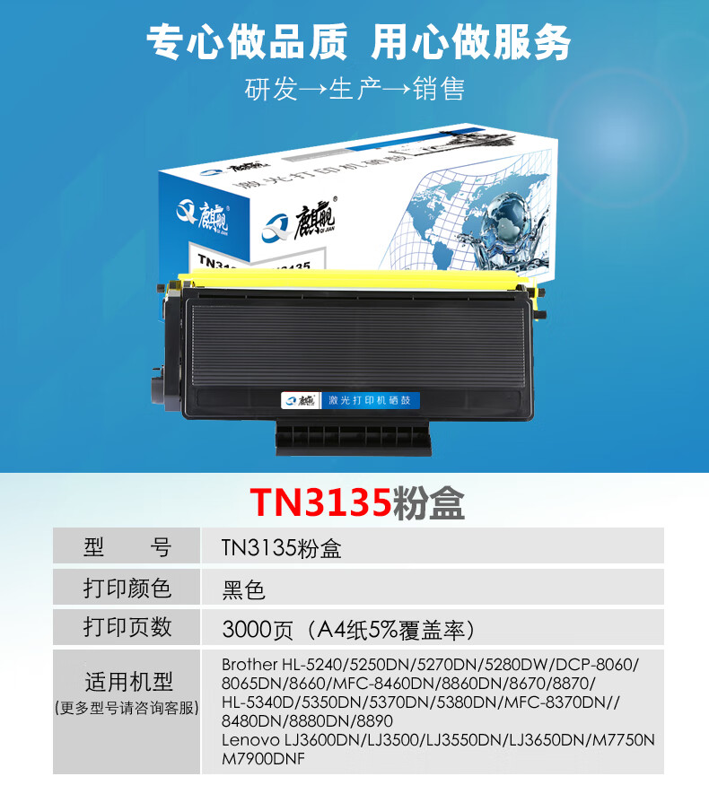 | 产品名称 : | 麒舰 TN3135粉盒 适用于兄弟3175/HL-5240/5250DN/5280DW/5380 打印机粉盒硒鼓 |