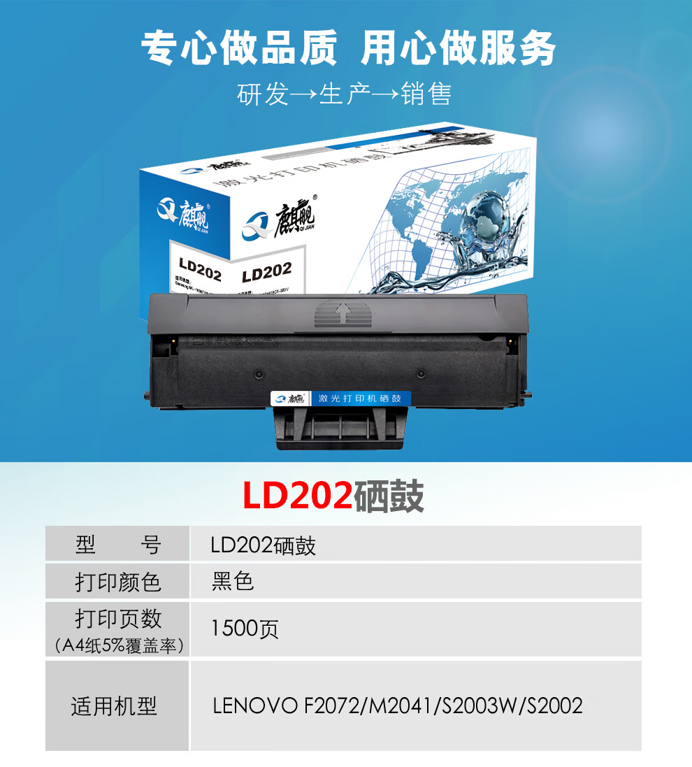 | 产品名称 : | 麒舰 LD202硒鼓 适用联想M2041硒鼓F2072联想S2002打印机墨盒S2003W硒鼓 |