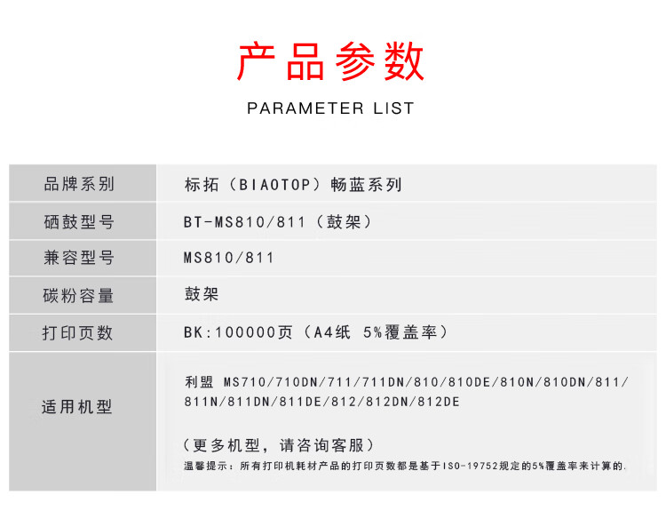 > 办公耗材 复印纸 硒鼓 > 打印耗材 > 硒鼓 > 标拓 (Biaotop) MS810/811硒鼓架适用利盟MS710/710DN/711/810//810DE/810N/810DN/811打印机 畅蓝系列| 产品名称 : | 标拓 (Biaotop) MS810/811硒鼓架适用利盟MS710/710DN/711/810//810DE/810N/810DN/811打印机 畅蓝系列 |
