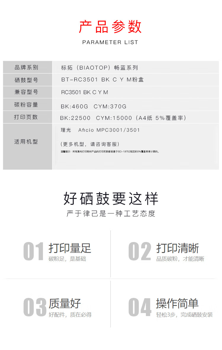 | 产品名称 : | 标拓 (Biaotop) RC3501蓝色粉盒适用理光Aficio MPC3001/MPC3501复印机 克隆系列 |
