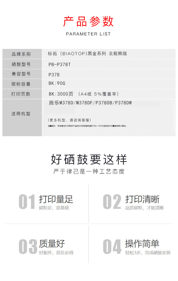 | 产品名称 : | 标拓 (Biaotop) P378T粉盒适用施乐M378D/M378DF/P378DB/P378DW打印机 北极熊版 |