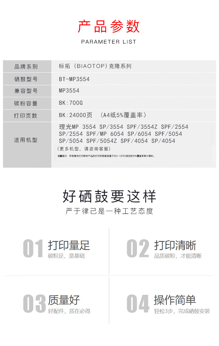 > 办公耗材 复印纸 硒鼓 > 打印耗材 > 硒鼓 > 标拓 (Biaotop) MP3554墨粉筒适用于理光MP 2554SP/2555/3054/ 3055 /3554SP复印机| 产品名称 : | 标拓 (Biaotop) MP3554墨粉筒适用于理光MP 2554SP/2555/3054/ 3055 /3554SP复印机 |