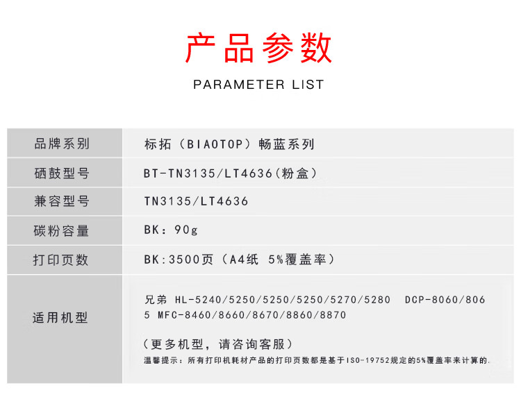 > 办公耗材 复印纸 硒鼓 > 打印耗材 > 硒鼓 > 标拓 (Biaotop) BT-TN3135/LT4636适用兄弟HL-5240/5250/5250/5250/5270/5280打印机 畅蓝系列| 产品名称 : | 标拓 (Biaotop) BT-TN3135/LT4636适用兄弟HL-5240/5250/5250/5250/5270/5280打印机 畅蓝系列 |